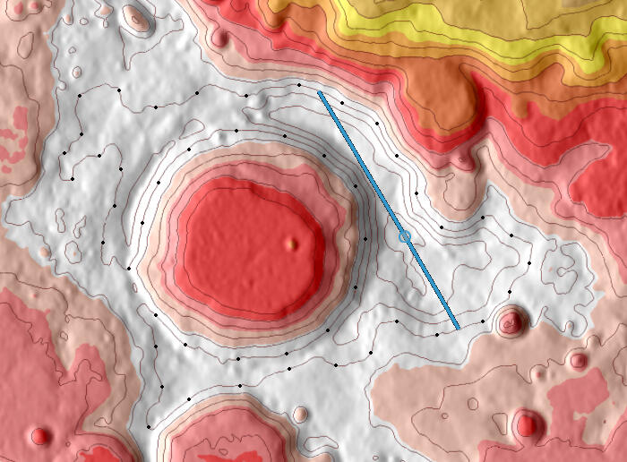 b) The height of a peak above the lowest contour line fully encircling itIn either case - how far to descend or the lowest closed contour - can be taken as the base of the rise. Consider Selenean Summit - marked by the small blue circle in Fig 11. A contour which encloses it (and skirts around the rim of Englehardt crater) is at an elevation of 9 km, highlighted by the black dots, and Fig 12 shows the profile of a transect across it. The graph reveals that this terrain slopes quite gently - rising 5.5° from 9 km to the summit from the left margin, and 3.5° from the right.