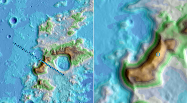 Mons Huygens is located on a ridge in the 550 km long arc-shaped Montes Appeninus (Appenines) range, which is part of the outer ring of the Imbrium basin. Fig 20 right panel shows its highest peak at 3.274 km above lunar datum at [Lat 19.526, Lon 357.096] to be on the rim of a 5 km crater, and it's also within 5 km of two other sub-peaks - one's 200m lower and the other 300m lower than the summit.The transect in Fig 20 left panel originates in the Appenine backslopes - an elevated area of ejecta from the Imbrium explosion. The transect cuts across Mons Huygens' summit, then down the Appenine front to the mare below. The mare is as flat as a pancake in this region of the Appenines, with an elevation almost dead on -2 km. The rubble of the backslopes also depletes the further back you travel from the Appenine front, until you're down to mare level again, as can be seen in Fig 18. No matter which way you go from the summit of Mons Huygens, you have to descend to the mare if you want to climb a higher peak. So per the height profile in Fig 21 along the transect, the base-to-peak height of Mons Huygens is 2.025+3.274 = 5.3 km.Fig 22 is an oblique 3D view of Mons Huygens from the mare. It corresponds to the transected region in Fig 20 left panel. The summit is marked with a blue circle.The Appenine front isn't smoothly continuous like 'conventional' crater rims. It may have been like that originally, but is serrated and irregular now as a result of collapsed blocks and landslides from the peaks.