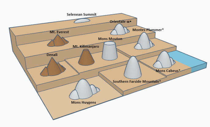 Figure 19 depicts the relative elevations and base-to-peak heights of some of the highest and tallest lunar features discussed so far, with those of Earth.A mountain with a cluster of smaller peaks just denotes it's part of a range. Of the three free-standing peaks, Southern Farside Mountain has a 'classic' mountain shape, Kilimanjaro's a truncated cone on account of being a volcano, and Mons Mouton is a mesa-like formation (a raised table-topped structure).There's nothing on Earth at the height of the back row, and for this comparison there are no terrestrial features in the front row either, as that's terrain at or below sea level. Otherwise, the mountains of the two worlds aren't entirely dissimilar in elevation and base-to-peak height in the middle two rows. It's also clear that Southern Farside Mountain's base-to-peak height is greather than any mountain on the Moon or Earth, and all the lunar mountains in the first and second rows are taller than Mons Huygens. In the next section we'll take a closer look at each of the mountains in Table 4.